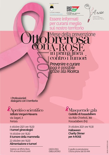 Nel mese dedicato alla prevenzione dei tumori femminili, l’associazione A-Rose propone infatti una serie di incontri “per essere informati e curarsi meglio” che sono gli Aperitivi scientifici in programma lunedì 4, giovedì 14 e venerdì 22 ottobre sempre alle 18.30 nella sede dell’Istituto Navarra Vergani (via Sogari 3, Ferrara) dove si parlerà rispettivamente delle strategie di cura e prevenzione per i tumori ginecologici, per il tumore della mammella e, infine, dei criteri per seguire un’alimentazione più sana. Domenica 31 ottobre alle 19 è in calendario un evento con cena e galà di festa nel Castello di Fossadalbero (via Aldo Chiorboli 366, Fossadalbero, Ferrara) dove verrà organizzato un ‘charity dinner’ a favore dell’associazione A-Rose con prenotazione obbligatoria e dove la serata proseguirà con il ‘Masquerade gala’, una ‘festa di Halloween contro la paura’.
