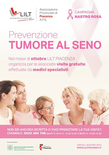Per tutto il mese di ottobre, Lilt Piacenza offre la possibilità di sottoporsi a visite senologiche effettuate da specialisti – gratuite per le associate – prenotando tramite lo 0523-384706 il martedì e giovedì dalle 15.30 alle 18, il mercoledì dalle 10 alle 13. E’ possibile aderire all’associazione anche nel momento stesso della visita.