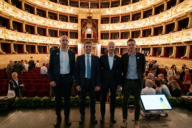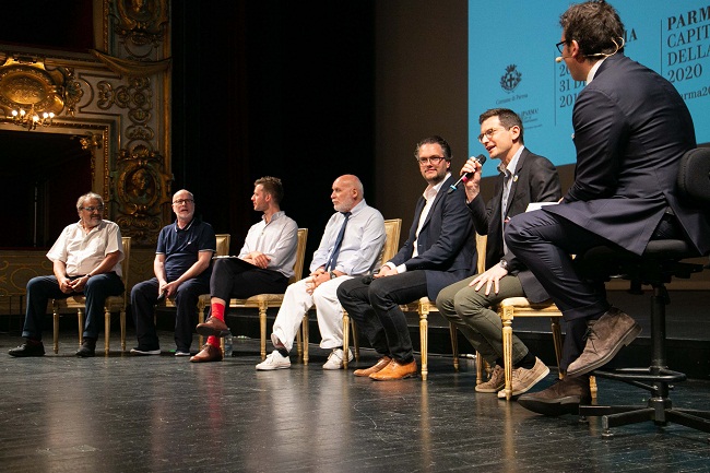 PARMA – Anton Salman Sindaco di Betlemme, Massimo Mezzetti assessore alla cultura Regione Emilia Romagna, l’illustratore Francesco Ciccolella, l’architetto Sangiorgi dello Studio Azzurro, il direttore creativo di Erik Spiekermann e Oliviero Toscani per alzare il sipario di Parma 2020.