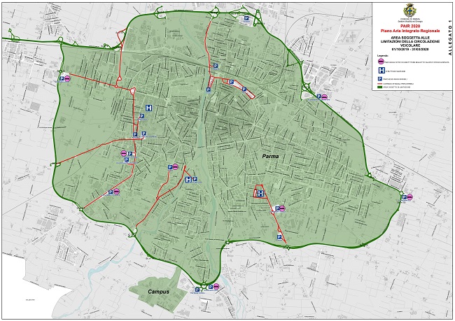 -dall’01/10/2019 al 31/03/2020, dal lunedì al venerdì, dalle 08.30 alle 18.30, in tutta l’area interna alle tangenziali come da planimetria allegato 1 (eccetto che nelle giornate festive del 01/11/2019 Ognissanti, 25/12/2019, 26/12/2019, 01/01/2020 e 06/01/2020) e nel parco Area delle Scienze (Campus Universitario), l’istituzione del divieto totale di circolazione per le seguenti categorie di veicoli: