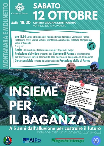 PARMA – Sabato 12 ottobre, dalle 18.30, al Centro Giovani Montanara di via Pelicelli 13/a, si svolgerà la serata “Insieme per il Baganza”, il momento vuole essere l’occasione per riflettere, confrontarsi e guardare al futuro a 5 anni dall’alluvione del torrente Baganza del 2014.