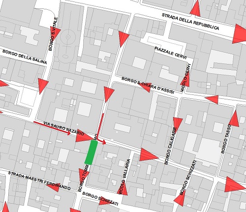 Trattandosi del tratto appena a Sud dell’intersezione con Via Nazario Sauro, si rende necessario dover aprire alla circolazione il tratto pedonalizzato di Via Sauro per dar sfogo al transito di vetture di residenti ed autorizzati, soprattutto in uscita da Borgo Tommasini primo tratto e Via Sauro primo tratto.