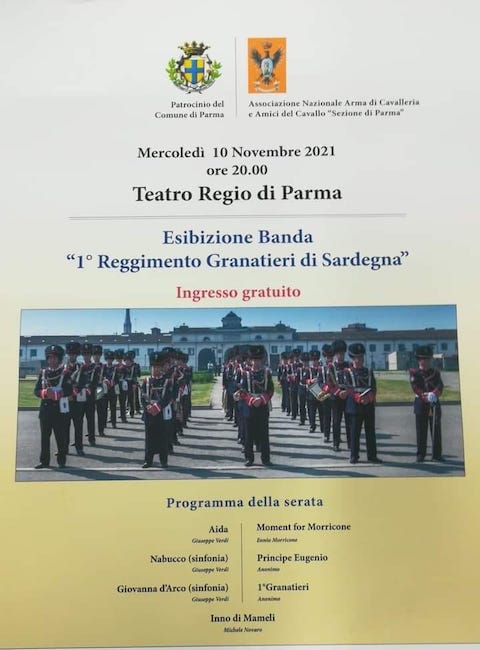 PARMA – È in programma mercoledì 10 novembre, alle 20, al Teatro Regio, l’esibizione della Banda del 1° Reggimento dei Granatieri di Sardegna in un concerto che sarà aperto a tutto il pubblico e a ingresso gratuito.