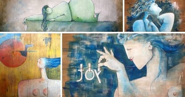 Se si pensa, dunque, alla fonte ispiratrice dei dipinti, si comprende più nitidamente la particolare attenzione per il colore blu, tradizionalmente associato alla parte maschile, dove però la sfumatura dolorosa non prevale. Qui, ci tiene a ribadire l’artista, non c’è un riferimento diretto all’espressione inglese “I’ve got the blues” che tende ad indicare uno stato di depressione e sofferenza, ma piuttosto l’espressione di una ricerca volta alla serenità, seppur nella consapevolezza che la propria metà sia venuta a mancare. Non a caso i quadri esposti conservano tutti una particolare cifra stilistica e cioè quella di rappresentare figure femminili morbide e materne, dipinte solo di profilo, in una prospettiva che rivela al mondo, dunque, una sola metà sopravvissuta e terrena, ma dove è ancora viva la forza di un sentimento d’amore profondo, proprio come il blu più intenso.