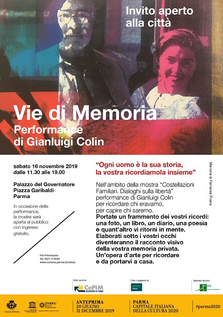 Sabato 16 novembre dalle ore 11.30 alle 19.00, Gianluigi Colin coinvolgerà gli abitanti di Parma nella realizzazione dell’azione artistica “Vie di Memoria”: tutti sono invitati a portare una immagine o un oggetto che fa parte della propria memoria personale – subito restituito al proprietario – che l’artista elaborerà con una fotocopiatrice, intervenendo poi con elementi pittorici. Le opere, timbrate e firmate, saranno realizzate in due copie: una sarà donata alla persona che partecipa all’azione, l’altra sarà esposta a Palazzo del Governatore e sarà inclusa nel grande archivio “Vie di Memoria”. Inoltre in questa speciale giornata l’ingresso alla mostra Costellazioni Familiari sarà gratuito.