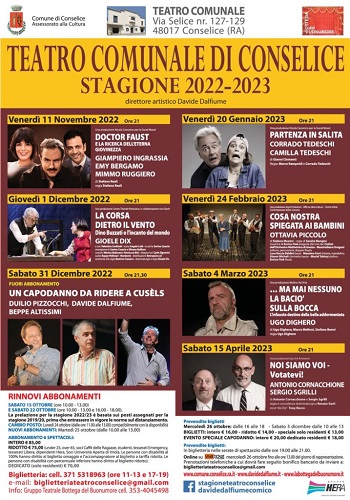 Lo spettacolo fa parte della stagione teatrale “Finalmente felicemente insieme” realizzata a cura del Teatro La Bottega del Buonumore APS con la direzione artistica di Davide Dalfiume e la collaborazione del Comune di Conselice. Per ulteriori informazioni visitare i siti internet www.comune.conselice.ra.it, www.labottegadelbuonumore.it o www.davidedalfiume.it, o scrivere a biglietteriateatroconselice@gmail.com