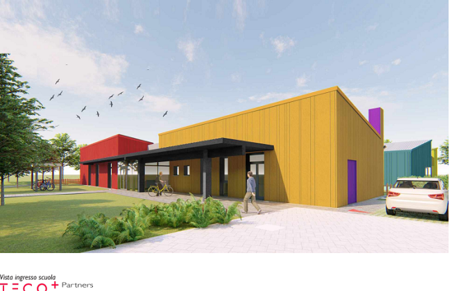 La nuova scuola avrà quattro sezioni che potranno ospitare cento bambini di età compresa tra i 3 e i 6 anni: ogni sezione avrà un proprio spazio atelier accessibile direttamente dall’aula. Tutte le sezioni avranno inoltre un affaccio diretto sul giardino, con una tettoia esterna contigua all’edificio, utile per svolgere attività all’aperto anche nelle giornate più soleggiate o quando piove. Il giardino avrà un percorso con fondo antiscivolo colorato e due piazzole con pavimentazione anti-trauma. Nel grande giardino di 2.300 metri quadrati ci saranno anche due sottosezioni recintate per attività speciali. E ancora, ci saranno due stanze dedicate al riposo, uno spazio per le attività con bambini disabili e un parcheggio interno per biciclette. La nuova scuola sarà dotata inoltre di un ampio locale utilizzabile per attività motorie indoor, come ad esempio quelle di psicomotricità. Ampio spazio sarà dedicato ai locali di servizio per il personale con due spogliatoi, lavanderia, dispensa e office.