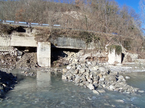 A seguito delle precipitazioni dell’ultimo mese, una deviazione della corrente del fiume Panaro ha determinato lo scalzamento del sistema di muro in sassi e gabbionate che difendono e sostengono della strada.
