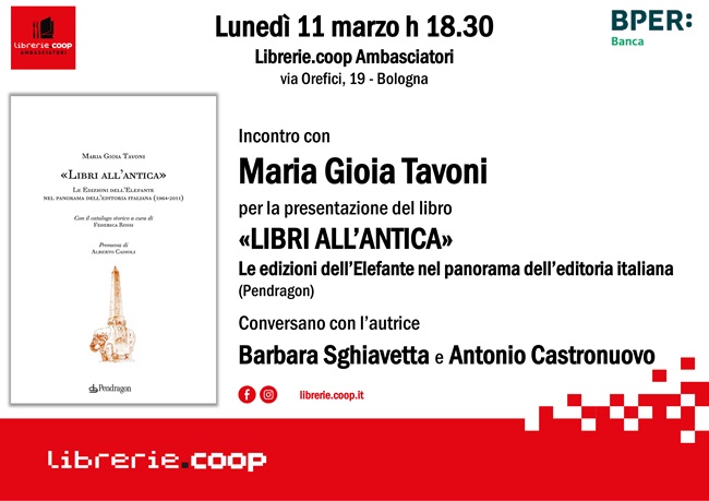 Maria Gioia Tavoni, già ordinaria di Bibliografia all’Università di Bologna, ha insegnato Storia del libro nel master “Editoria cartacea e multimediale” istituito da Umberto Eco e in alcuni dottorati di ricerca. Ai numerosi saggi stampati anche all’estero, unisce, fra le monografie: Circumnavigare il testo (Liguori, 2009), tradotto in spagnolo (2020); Pascoli e gli editori (Pàtron, 2012), scritto con con Paolo Tinti e vincitore del Premio Fiorino d’oro. Con Alessandro Corubolo, Torchi e stampa al seguito (Pendragon, 2016), tradotto in spagnolo (2021), ha ottenuto la menzione d’onore nel medesimo concorso fiorentino. Con il libro Storie di libri e tecnologie (Carocci, 2021), ha ricevuto un premio alla carriera. Insieme a Barbara Sghiavetta per Pendragon ha pubblicato Guida per bibliofili affamati (2014) e ha curato i volumetti Atti del forum dei bibliofili affamati (2016). È inoltre autrice di Il popolo, il territorio (2019), Le angosce di Luciano De Vita ricomposte nei suoi libri d’artista (2019).