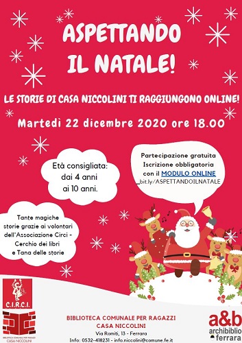 FERRARA – Due regali per i più piccoli sono in arrivo dalla biblioteca comunale per ragazzi di Casa Niccolini in occasione delle prossime feste. Martedì 22 dicembre 2020 e martedì 5 gennaio 2021 alle 18 sono infatti in agenda due nuovi appuntamenti con le letture online (su Google Meet) per aspettare insieme il Natale e l’arrivo della Befana. In programma tante storie per i piccoli ascoltatori dai 4 ai 10 anni proposte dalle narratrici e dai narratori volontari dell’associazione Circi – Cerchio dei libri e Tana delle storie, coordinati da Silvia Dambrosio.