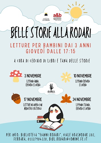 FERRARA – Nuovo appuntamento giovedì 10 novembre 2022 alle 17.15 con le ‘Belle storie’ per bambini dai 3 anni alla biblioteca comunale Rodari di Ferrara (viale Krasnodar 102).