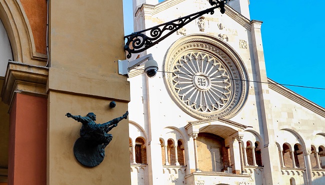 Il video si intitola “La rovesciata più bella” in omaggio all’opera dell’artista modenese Wainer Vaccari, collocata a due passi dal Duomo dove c’era l’edicola dal 1945 della famiglia Panini, rimossa a maggio di quest’anno. L’opera in bronzo raffigura, appunto, una interpretazione della mitica rovesciata del calciatore Carlo Parola, graficizzata nel 1970 proprio da Wainer Vaccari per farne l’immagine degli album, delle bustine e delle figurine delle raccolte “Calciatori” Panini.