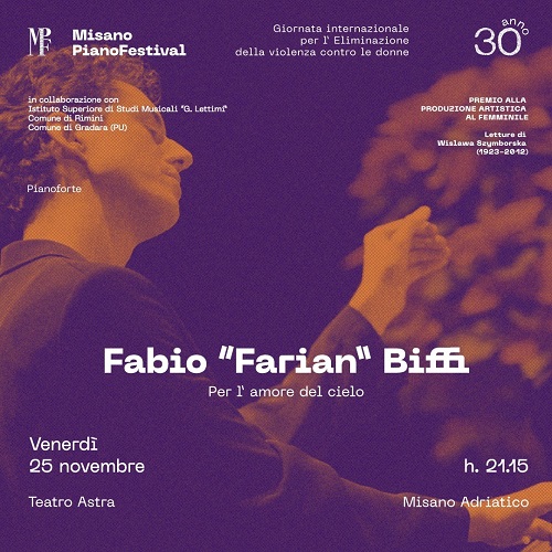 MISANO ADRIATICO (RN) – L’Associazione Alfredo Speranza APS di Rimini con il contributo della Regione Emilia Romagna e la collaborazione del Comune di Misano Adriatico, nell’ambito della programmazione del MisanoPianoFestival che quest’anno ha celebrato trent’anni di attività con un’edizione speciale dal titolo Viaggio infinito dell’anima, presenta l’evento musicale Per l’amore del cielo che si terrà venerdì 25 Novembre 2022, GIORNATA INTERNAZIONALE PER L’ELIMINAZIONE DELLA VIOLENZA CONTRO LA DONNA, al Teatro Astra di Misano Adriatico.