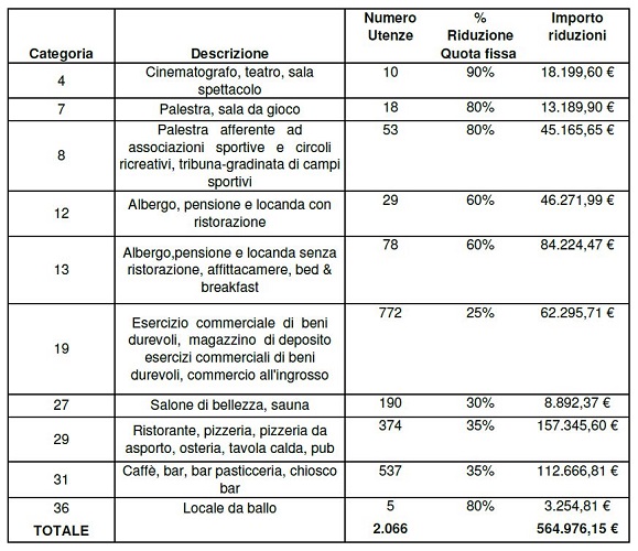 Le riduzioni riguarderanno la quota fissa della tariffa rifiuti e saranno applicate in percentuali variabili dal 25% al 90% a seconda della categoria economica (v. tabella)