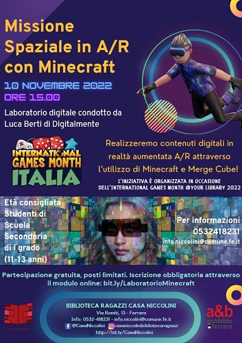 Il laboratorio è condotto da Luca Berti di Digitalmente ed è organizzato in occasione dell’International Games Month @your Library 2022