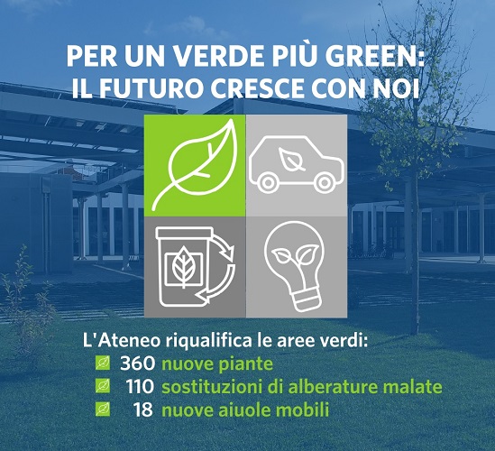 Il progetto di riqualificazione delle alberature e delle aree verdi, al quale l’Università sta lavorando intensamente, anche con la proficua collaborazione del Consorzio forestale Kilometro Verde, ha preso avvio con un’analisi dello stato di salute delle piante e la realizzazione di uno studio ad hoc, con l’individuazione anche di nuove aree consone alla piantumazione con specie idonee al clima locale. Dalle analisi è emersa la necessità di una serie di interventi di manutenzione e, in qualche caso, anche di abbattimenti di piante dalla salute definitivamente compromessa, “compensati” da nuove piantumazioni e altro.