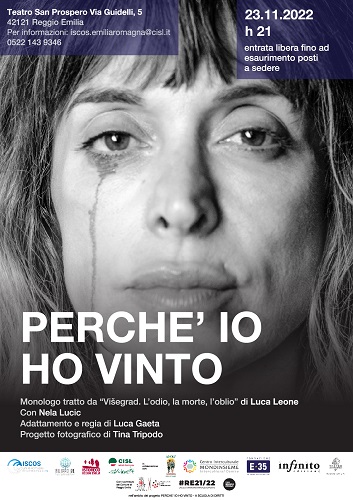REGGIO EMILIA – Torna in scena “PERCHE’ IO HO VINTO”, il monologo teatrale ispirato alla vicenda di Bakira Hašečić, la “Lady Wiesenthal” della Bosnia Erzegovina, capace di reagire alle numerose violenze subite da lei, dalla sua famiglia e da altre donne della sua comunità e di dedicare la sua vita alla denuncia degli aggressori e dei criminali responsabili di stupri ed eccidi a Višegrad tra il 1992 e il 1994. Una storia di straordinaria forza e coraggio messa in scena dall’attrice bosniaca Nela Lucic e con la regia di Luca Gaeta, su un testo tratto da “Višegrad. L’odio, la morte, l’oblio” di Luca Leone (Infinito edizioni), portato in scena proprio in occasione della Giornata Internazionale per l’eliminazione della violenza sulle donne, su iniziativa di ISCOS Emilia-Romagna e IPSSC Filippo Re, al Teatro San Prospero di Reggio Emilia la sera del 23 novembre alle ore 21 (ingresso libero) e sarà preceduto da due matinée per gli studenti delle scuole superiori della città nelle mattine del 22 e 23 novembre. La serata sarà arricchita dalla partecipazione dell’attivista Tamara Cvetkovic e di Luca Leone, autore del libro da cui è tratto il monologo.