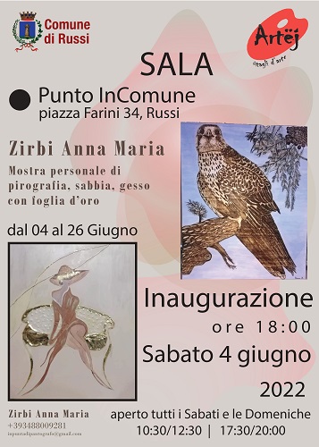 RUSSI (RA) – Proseguono nel mese di giugno le mostre degli artisti dell’Associazione Culturale Artej di Russi con Anna Maria Zirbi e la sua mostra personale di pirografia, sabbia e gesso con foglia d’oro.