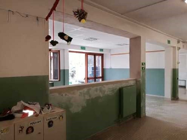 I lavori sono stati eseguiti dall’ATI Camst-Rivotti ed hanno riguardato, come richiesto, lo spostamento del serramento di ingresso verso l’esterno della parte coperta, recuperando così uno spazio fino ad ora non utilizzato e che diventa non solo un ingresso arioso, ma un saloncino per la lettura e la drammatizzazione, un angolo ludico e di sperimentazione ad oggi assente nella scuola.