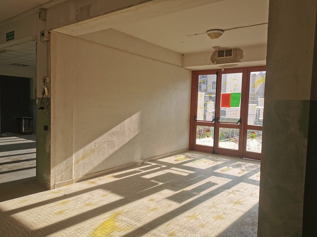 Inoltre, è stata realizzata, sulla parete del primo refettorio, l’apertura di un passaggio di circa tre metri ed una grande finestra (senza infisso) così da allargare lo spazio del corridoio e la percezione degli ambienti, rendendoli più flessibili, fruibili e permeabili.