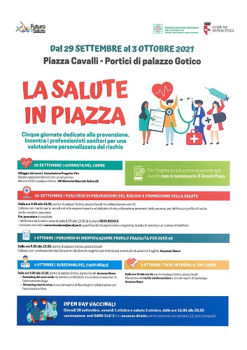 PIACENZA – Cinque giornate dedicate alla prevenzione, con i professionisti sanitari che scendono in piazza per una valutazione personalizzata del rischio dei cittadini e per promuovere salute. Dal 29 settembre al 3 ottobre, il cuore della città ospita una serie di iniziative realizzate dall’Azienda Usl di Piacenza in collaborazione con il Comune di Piacenza e alcuni partner.