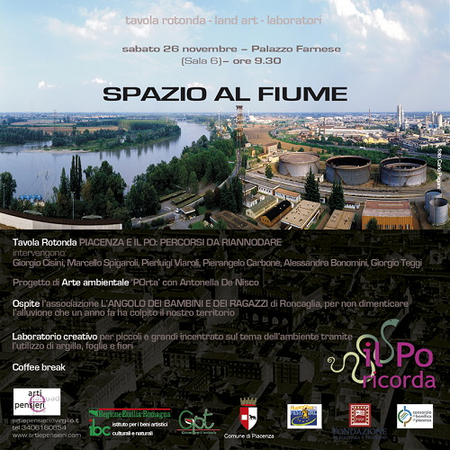 A latere del workshop, lo sguardo dell’artista Antonella de Nisco che illustrerà il progetto POrta creato per IL PO RICORDA al fine di “ricucire” idealmente il tessuto urbano restituendo senso allo spazio di confine attraverso i suoi interventi di land art allestiti a Palazzo Farnese, alla Porta del Soccorso e sull’argine, con cui ha inteso dare voce al paesaggio e segnare un percorso di riavvicinamento al Po, custode di un’identità ancestrale da riscoprire e valorizzare.