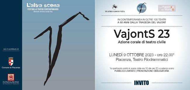 A Piacenza Vajonts 23 sarà messo in scena da Teatro Gioco Vita al Teatro Filodrammatici nell’ambito del Festival “L’altra scena”, grazie al contributo di Comune di Piacenza e Fondazione di Piacenza e Vigevano. Dalle ore 10 fino alle ore 22 a cadenza oraria lo spettacolo sarà ripetuto, la mattina per le scuole e dal pomeriggio per tutto il pubblico. L’ultima rappresentazione sarà alle ore 22 e alle ore 22.39, l’ora in cui la montagna è franata nella diga, ci si fermerà. Insieme a tutti i 130 teatri aderenti alla rete di VajontS 23.