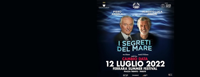 FERRARA – A causa di problemi tecnico-logistici, derivanti da fornitori e aziende terze, l’evento previsto Domenica 3 Luglio 2022 PIERO ANGELA e ALBERTO LUCA RECCHI presentano I SEGRETI DEL MARE, è posticipato a Giovedì 12 Luglio 2022 sempre in Piazza Trento Trieste – Ferrara.