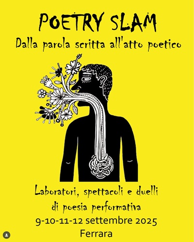 Quest’anno il festival cresce: oltre al laboratorio di scrittura creativa e ricerca espressiva per giovani dai 14 ai 30 anni con slam poetry finale e al Poetry KIDS, per ragazzi e ragazze dagli 8 ai 13 anni in cui muovere i primi passi nel mondo della poesia, ci sarà Lorenzo Maragoni, campione mondiale di Poetry Slam, con il suo spettacolo Stand-Up Poetry. Saranno poi ospiti quattro tra le più interessanti voci della poesia performativa nostrana, per una serata creata appositamente per Ferrara: Giuseppe Armillotta, Danna, Eugenia Galli, Gennaro Màdera. A concludere la rassegna venerdì 12 l’atteso duello poetico, lo slam poetry, che vedrà in scena i partecipanti al laboratorio (14-30 anni) che si sfideranno a suon di parole guidati dall’M.C. (maestro di cerimonia) Gennaro Màdera, dell’associazione PoeMare APS e dal pubblico che gioca il ruolo di scanzonato giudice dello spettacolo-gara.