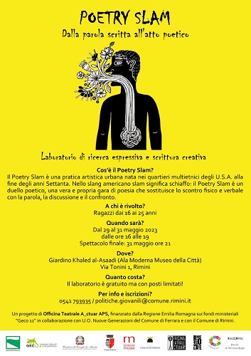 RIMINI – Dal 29 al 31 maggio a Rimini si terrà il ‘Poetry Slam – Dalla parola scritta all’atto poetico’, un laboratorio di scrittura creativa promosso da Officina Teatrale Actuar che si ispira al duello poetico nato come pratica artistica urbana nei quartieri multietnici del Bronx alla fine degli anni Settanta. Una pratica che vuole spingere i partecipanti a mettersi in discussione elaborando il conflitto, lo scontro e il disaccordo attraverso attività che mirano alla risignificazione degli stessi tramite l’espediente del ‘duello’ poetico. Momento cardine del percorso sarà poi lo spettacolo finale, il ‘Poetry Slam’, una sorta di gara scanzonata dove il pubblico è chiamato a partecipare in qualità di giurato sotto la guida degli ‘mc’, i maestri di cerimonia. I partecipanti si sfideranno a suon di rime, ma alla fine a vincere sarà la poesia e la comunità che attorno a essa si è radunata.