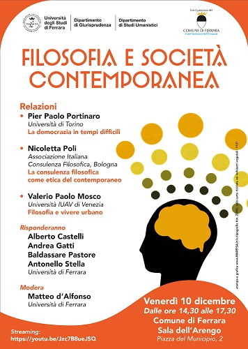 L’incontro, a cura dell’Università di Ferrara con il patrocinio del Comune di Ferrara, sarà aperto dalle relazioni di Pier Paolo Portinaro dell’Università di Torino su ” La democrazia in tempi difficili”; di Nicoletta Poli dell’Associazione Italiana Consulenza Filosofica di Bologna su ” La consulenza filosofica come etica del contemporaneo” e di Valerio Paolo Mosco dell’Università IUAV di Venezia su “Filosofia e vivere urbano”.