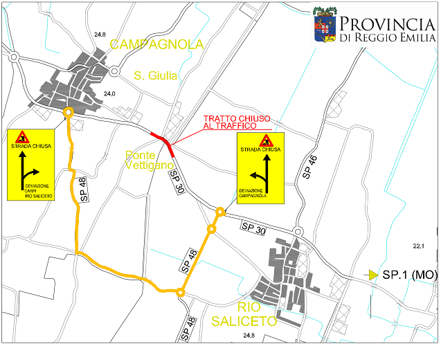 REGGIO EMILIA – La Provincia di Reggio Emilia informa che, come già anticipato nei giorni scorsi, sabato 29 gennaio, dalle 8.30 alle 13, la Sp 30 Novellara-Campagnola-Rio Saliceto sarà chiusa al transito in corrispondenza del ponte stradale all’intersezione con via Naviglio Nord, in località Ponte Vettigano, tra i comuni di Rio Saliceto e Campagnola Emilia. Il provvedimento è finalizzato a consentire lo svolgimento in sicurezza di lavori di ripristino delle bitumature, in corrispondenza dei raccordi di acceso al tratto a senso unico alternato in corrispondenza del cantiere di realizzazione della nuova rotatoria.