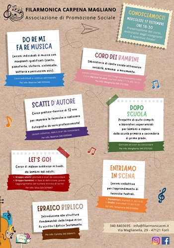 La presentazione dei corsi si terrà mercoledì 17 settembre ore 18.30 presso il teatrino del Circolo Acli di Magliano – Via Maglianella n. 29 (47121 Forlì) e, per stare in tema, si concluderà in bellezza con un piccolo concerto a cura degli insegnanti di musica dell’associazione.