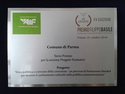 PARMA – L’AIF – Associazione Italiana Formatori – ha conferito al Comune di Parma il 3° premio nellanel corso del XIII Convegno Nazionale Pubblica Amministrazione e XV Premio “Filippo Basile”, che si è tenuto a Trieste nei giorni 20 – 21 ottobre 2016.