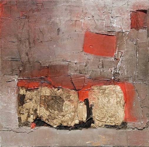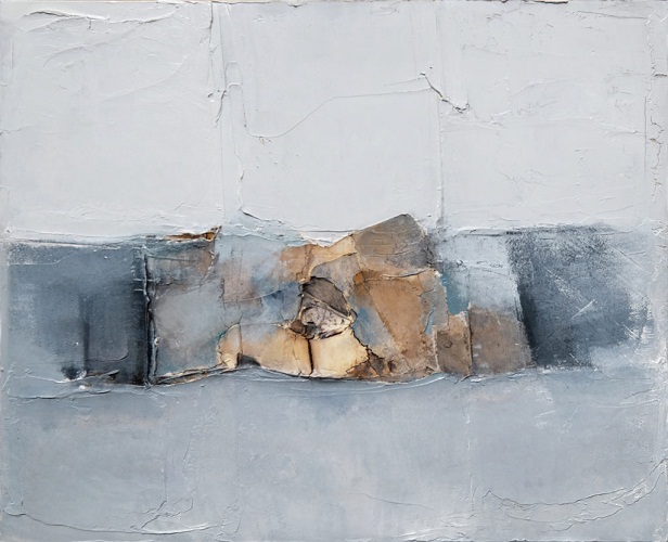 Cosa rende moderna questa lingua desueta “pura” e “arcaica”? Queste tele dense di materia per processi febbrili a “tecnica mista” (bitumi, colle, colori a olio, calce) in cui agiscono – agivano anzi – i passaggi del tempo ciclico delle stagioni e poi, via via, strutture e architetture primordiali (tombe e culle insieme), stratificazioni di vittime in fosse comuni? Moderna è la messa in atto di “un arroccamento lirico”, di una purezza che trasuda rigetto dei tempi spuri che corrono, rigore artistico quale rigore morale. Moderno è l’isolamento della esperienza artistica, il fare arte da sé, che si fonda sull’alchimia di una materia mescolata a formule magiche, iniziatiche, da cui nasce con i suoi sintagmi questa “lingua pura”. Pittura separata, materia pittorica prodotta da gnomi fiabeschi (alchimisti sono e lavorano con grandi mescole alle mutazioni della materia, al raffinamento dei bianchi, dei grigi dominanti) per una lingua pura. All’inizio il racconto era di natura – orizzonti di pianura, densità atmosferiche e nebbie, le terre della Bassa – poi una scelta cromatica e una figurazione di rovine, di distruzione della natura con citazioni di resti di civiltà e umanità. La ricerca degli ultimi lavori è sulla memoria – come storia dei vinti – che la materia include, protegge e tramanda. Le ultime tele sono una esposizione della condizione umana, una vera e propria messa in scena, un palco dei supplizi, un annuncio del presente martoriato.
