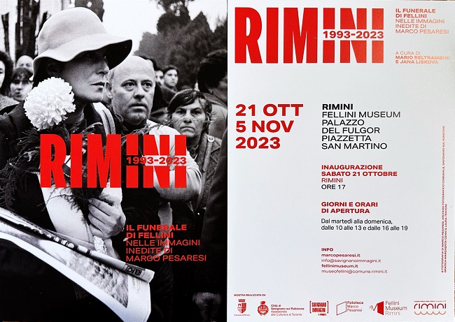 Trenta anni dopo la città di Rimini rende omaggio alla “dimensione universale di quel cordoglio” con una mostra dal titolo “Rimini 1993-2023: il funerale di Fellini nelle immagini inedite di Marco Pesaresi”, a cura di Mario Beltrambini e Jana Liskova e realizzata dal Comune di Rimini in collaborazione con il Comune di Savignano sul Rubicone e l’associazione Savignano Immagini.