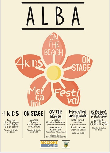 L’ormai affermata “Alba 4 Kids”, quest’anno curata da Alex Gabellini, divertirà i più piccoli con intrattenimento teatrale e di giocoleria, a giovedì alterni nei mesi di giugno, luglio ed agosto negli spazi dei Giardini dell’Alba.