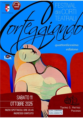 CORTEGGIANDO, festival di corti teatrali, giunto quest’anno alla 14a edizione, è organizzato da Gruppo Teatrale Quarta Parete APS ed è ospitato nel rinnovato Teatro San Matteo in Piacenza.
