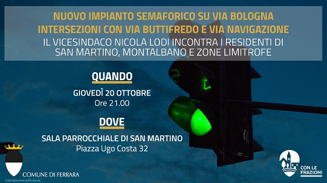 FERRARA – Giovedì 20 ottobre 2022 alle 21 nella Sala Parrocchiale di San Martino (piazza Ugo Costa, 32), il vicesindaco di Ferrara Nicola Lodi presenterà ai residenti di San Martino, Montalbano e zone limitrofe il progetto del nuovo impianto semaforico, che sarà realizzato su via Bologna, all’incrocio con le vie Buttifredo e Navigazione.