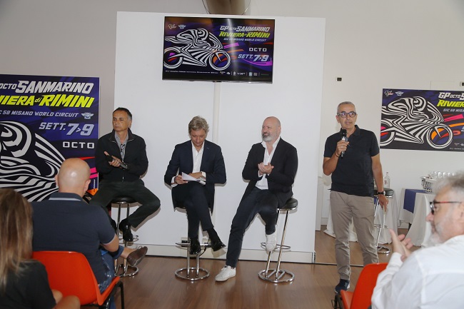 Ieri mattina alla sala press conference di Misano World Circuit, in occasione della presentazione del Gran Premio OCTO di San Marino e della Riviera di Rimini erano presenti: Stefano Bonaccini (Presidente Regione Emilia Romagna), Andrea Corsini (Assessore al Turismo Regione Emilia Romagna), Andrea Gnassi (Presidente Destinazione Romagna e Sindaco di Rimini), Augusto Michelotti (Segretario di Stato al Turismo della Repubblica di San Marino), Marco Podeschi (Segretario di Stato allo Sport della Repubblica di San Marino), Stefano Giannini (Sindaco di Misano), Renata Tosi (Sindaco di Riccione), Gianni Giovanardi (Assessore Sport Bellaria Igea Marina), Mariano Gennari (Sindaco di Cattolica), Luca Colaiacovo (Presidente Santa Monica SpA), Andrea Albani (Managing Director Misano World Circuit), Andrea Cicchetti (Coordinatore MotoGP), Andrea Maticevic (Communication Manager Octo), Mattheuw Vagnini (Direttore Commerciale Colorificio Sammarinese), il pilota Ducati Michele Pirro, l’ex campione del mondo Kevin Schwantz oltre al designer Aldo Drudi.