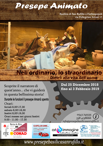 FORLIMPOPOLI (FC) – Nella Basilica di San Rufillo a Forlimpopoli sarà possibile visitare il PRESEPE ANIMATO. Il titolo della rappresentazione è: “NELL’ORDINARIO, LO STRAORDINARIO”. Il presepe è tutto meccanizzato e con l’aiuto di un narratore racconta varie scene della vita di Gesù. Il presepe rimarrà aperto dal 25 dicembre al 3 febbraio e il ricavato delle offerte sarà devoluto alle suore francescane di Cristo, per le loro missioni in Brasile. Per informazioni 3384138666 (Bruno) o visitate il sito internet: www.presepebasilicasanrufillo.it