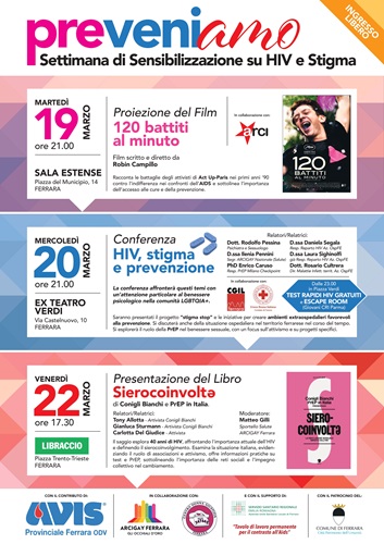LA SCHEDA a curta degli organizzatori – “Preveniamo – Settimana di sensibilizzazione su Hiv e stigma” è il titolo dell’iniziativa che Avis Provinciale Ferrara, Arcigay Ferrara – Gli occhiali d’oro e Centro Donna Giustizia hanno organizzato con il supporto dell’Azienda ospedaliero-universitaria e Ausl Ferrara e del Tavolo Permanente di contrasto all’AIDS e con il patrocinio del Comune di Ferrara, allo scopo sia di promuovere il dialogo e di fare prevenzione su questo tema sia di contrastare lo stigma che accompagna ancora troppo spesso le persone che vivono con HIV.