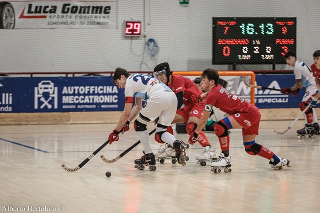 La ripresa si apre allo stesso modo, con Scandiano che fatica a farsi vedere dalle parti di Maggi e Cardella che poco dopo la mezz’ora ruba palla su un passaggio a metà pista e si invola a tu per tu con Taiti, siglando lo 0-3. I padroni di casa riescono finalmente a reagire, prima con un tiro diretto che Tognacca non riesce a realizzare per un soffio, poi con il palo colpito da posizione ravvicinata da Uva; a sigillare apparentemente il match arriva, al 40’, il poker ospite, con Bigatti che allunga ancora il gap. La risposta d’orgoglio della capolista arriva, prima con De Stefano, che abbatte il muro dei toscani, poi con Tognacca, che realizza il secondo tiro diretto guadagnato per bonus di falli e dimezza lo svantaggio. Il finale è incandescente, con Roca che coglie il palo e i padroni di casa che tentano l’assedio; allo scadere, arriva però il rigore guadagnato e trasformato da Carrieri, oltre al doppio blu rimediato da Roca, che fissano il punteggio sul definitivo 2-5. Scandiano rimedia il primo stop in campionato e viene ripresa in vetta alla classifica da Camaiore, vittoriosa con la SPV Viareggio: sabato 17 Gennaio si torna in pista, proprio per il big match in trasferta sul campo di Camaiore.