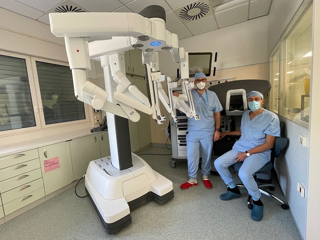 (nella foto, da sx, Giovanni Zarlenga, Coordinatore infermieristico del blocco operatorio di Forlì e il prof. Giorgio Ercolani con il robot Da Vinci XI)