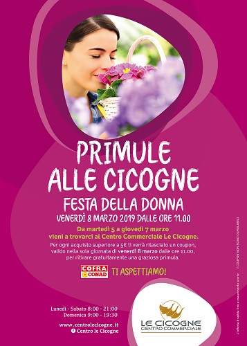 FAENZA (RA) – Venerdì 8 marzo 2019, a partire dalle ore 11.00, al Centro Commerciale Le Cicogne – Via G. Galilei, n. 4, Faenza (RA), verrà offerta, fino a esaurimento scorte, una graziosa primula a ogni cliente che sarà in possesso del buono omaggio.