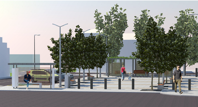 L’intervento prevede la realizzazione di una piazza pavimentata con la piantumazione di essenza arboree in sintonia con la piazza stessa, al posto degli attuali pini marittimi, e la creazione di una struttura in acciaio leggera, un pergolato.