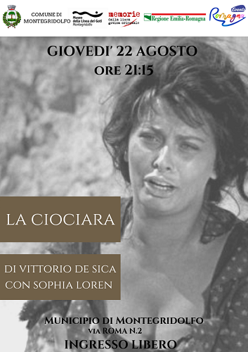 MONTEGRIDOLFO (RN) – Giovedì 22 agosto alle ore 21.15 presso il Municipio di Montegridolfo, secondo appuntamento della rassegna cinematografica Dalla Liberazione alla Caduta del Muro, con il film di Vittorio De Sica La ciociara.
