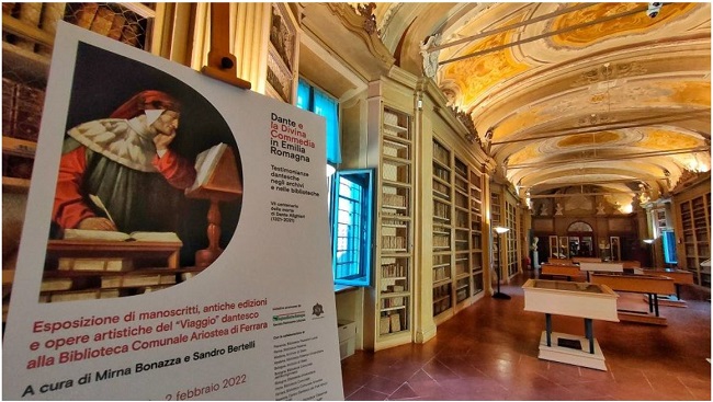 FERRARA – L’Esposizione di manoscritti, antiche edizioni e opere artistiche del “Viaggio” dantesco alla Biblioteca comunale Ariostea di Ferrara, curata da Mirna Bonazza, responsabile U.O. Biblioteche del Comune di Ferrara, e da Sandro Bertelli, docente di Paleografia e di Codicologia all’Università di Ferrara, è stata prorogata fino al prossimo 16 aprile 2022. La mostra, allestita a palazzo Paradiso (via delle Scienze, 17), sede della Biblioteca comunale Ariostea, nelle sale Ariosto e Carli, in occasione del settimo centenario della morte di Dante Alighieri (1321-2021) e inaugurata lo scorso 2 settembre, rientra in un progetto che coinvolge numerosi archivi e biblioteche dell’Emilia-Romagna ed è stata promossa dalla Regione stessa e dalla Società Dantesca Italiana.