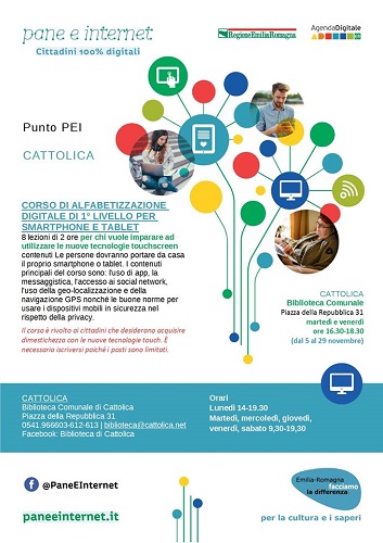 CATTOLICA (RN) – Continua il programma dell’autunno 2019 di corsi e incontri “Pane e Internet” presso la Biblioteca Comunale di Cattolica, nell’ambito dell’Agenda Digitale della Regione Emilia Romagna, progetto Cittadini 100% digitali. La finalità è offrire opportunità di alfabetizzazione informatica e apprendimento continuo sull’uso delle tecnologie digitali e dell’accesso a Internet ai cittadini a rischio di esclusione digitale. Si tratta principalmente di anziani, donne (in particolare casalinghe), soggetti fragili, chi è in cerca di occupazione e/o ha un basso livello di scolarità e i segmenti più deboli della popolazione immigrata.