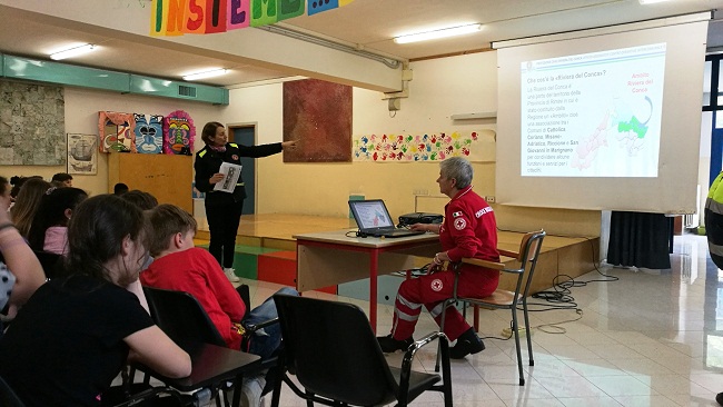 Ai ragazzi è stato presentato il sistema di Protezione Civile dell’ambito della “Riviera del Conca” che comprende i Comuni di Cattolica, Coriano, Misano Adriatico, Riccione e San Giovanni in Marignano. L’attività di formazione ha coinvolto l’Assessore con delega al ramo Fausto Battistel, Maria Vittoria Prioli responsabile dell’Ufficio Ambiente e componente del presidio territoriale di Protezione Civile, l’insegnante Marisa Mancini, oltre a vari volontari dell’Associazione “Arcione” e della Croce Rossa.